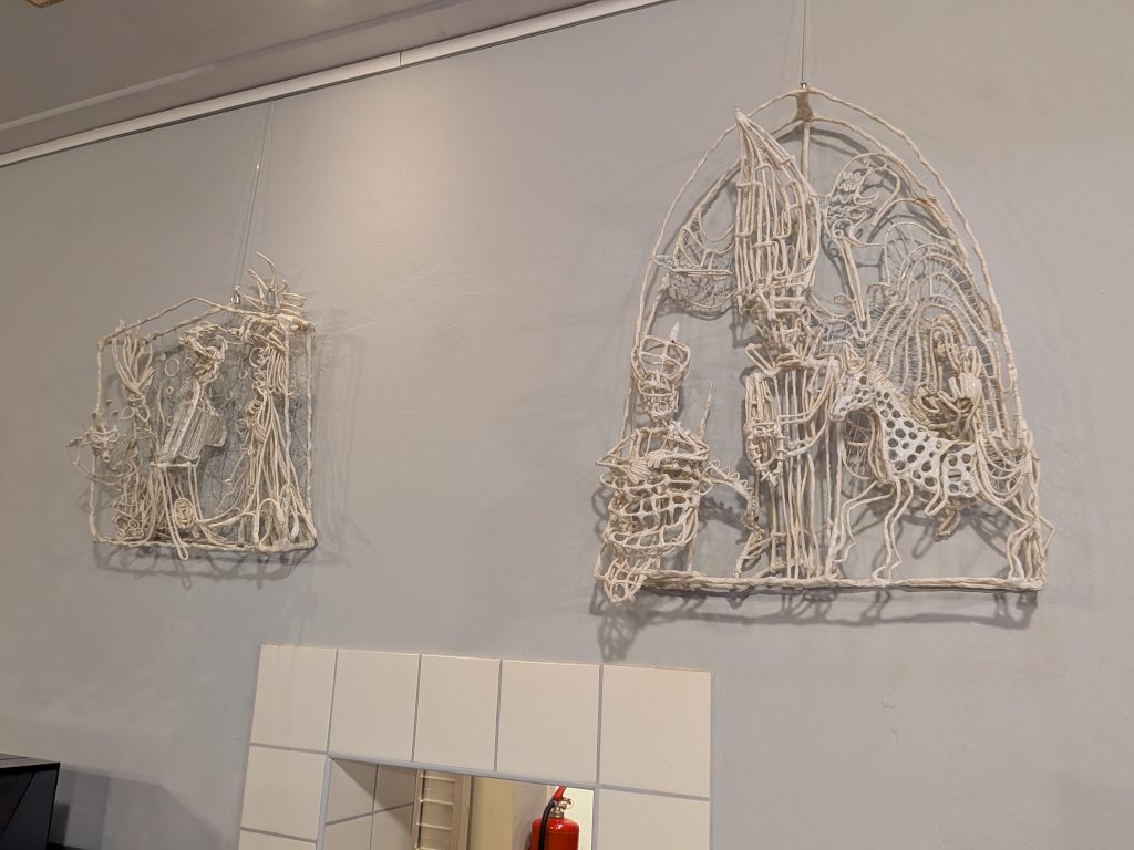 Caroline Kortenhorst uit Brummen onder het thema: “Harnas voor de kwetsbaren” Ze schrijft daar over: “Mijn werken groeien letterlijk vanuit mijn handen, metaaldraad geknoopt, omwikkeld met papier-tape en snippers karton. Verhalen verstild, reliëfs, groeisels. Uit het één komt het ander, er komt nog veel mee.